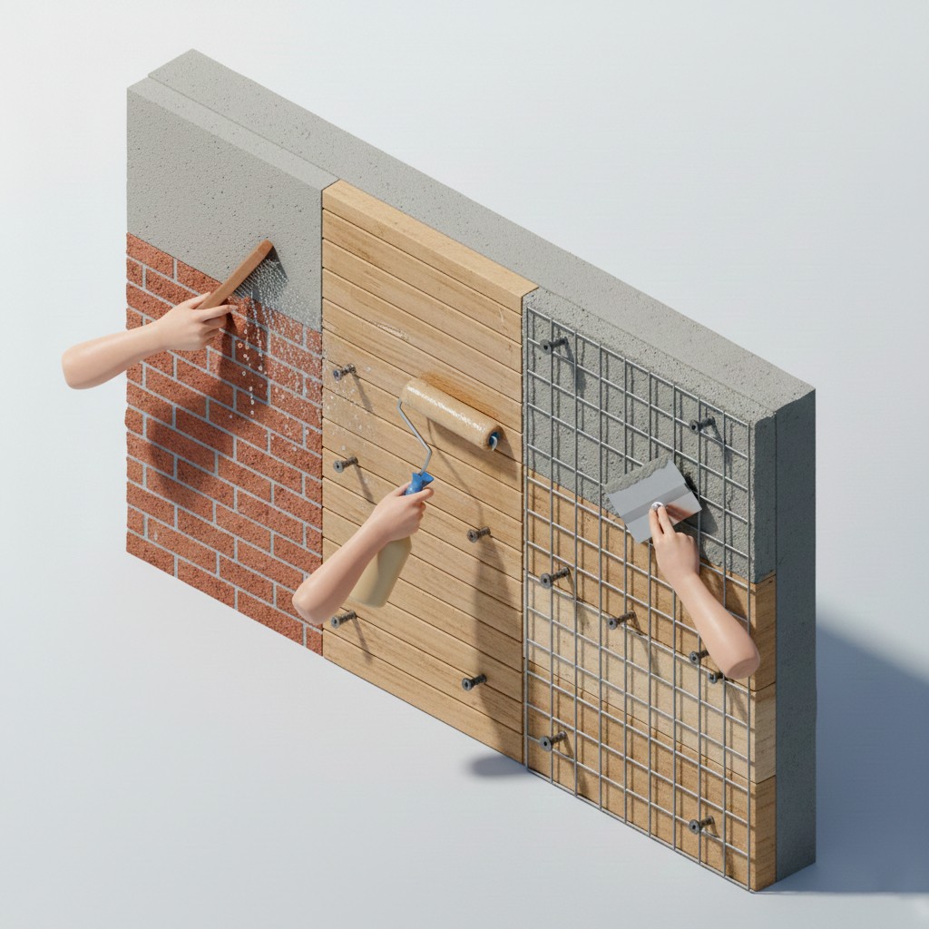Base Coat: For mesh surfaces, apply a thin cement layer and let dry for 24-48 hours. Concrete and brick walls only need cleaning and light moistening.