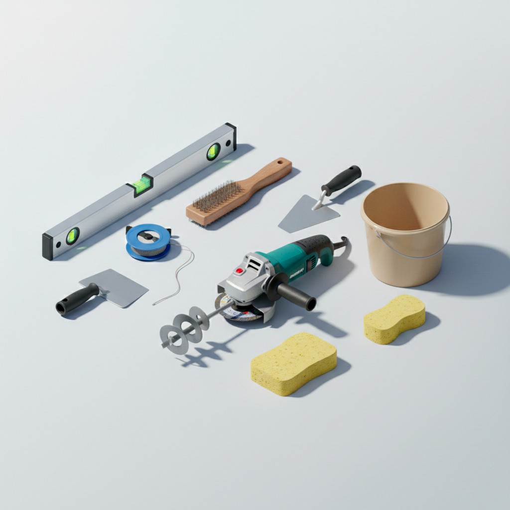 - Notched trowel, Angle grinder (diamond blade).